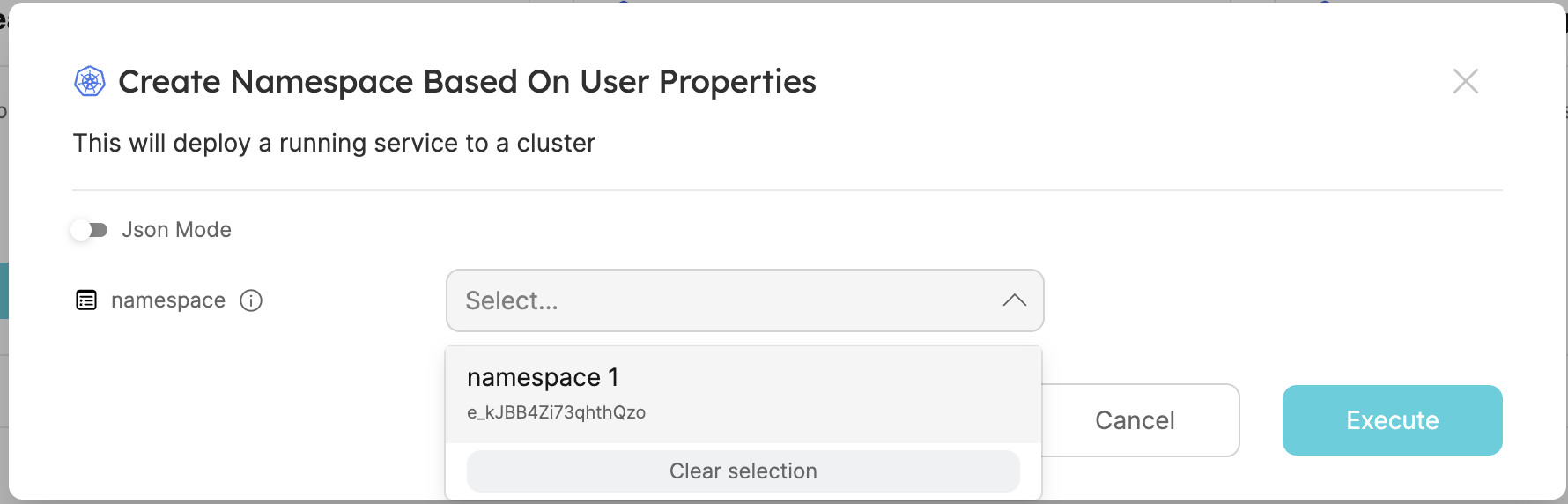 The user will be required to choose a cluster, then the namespace input list will be populated with namespace entities related to the chosen cluster.