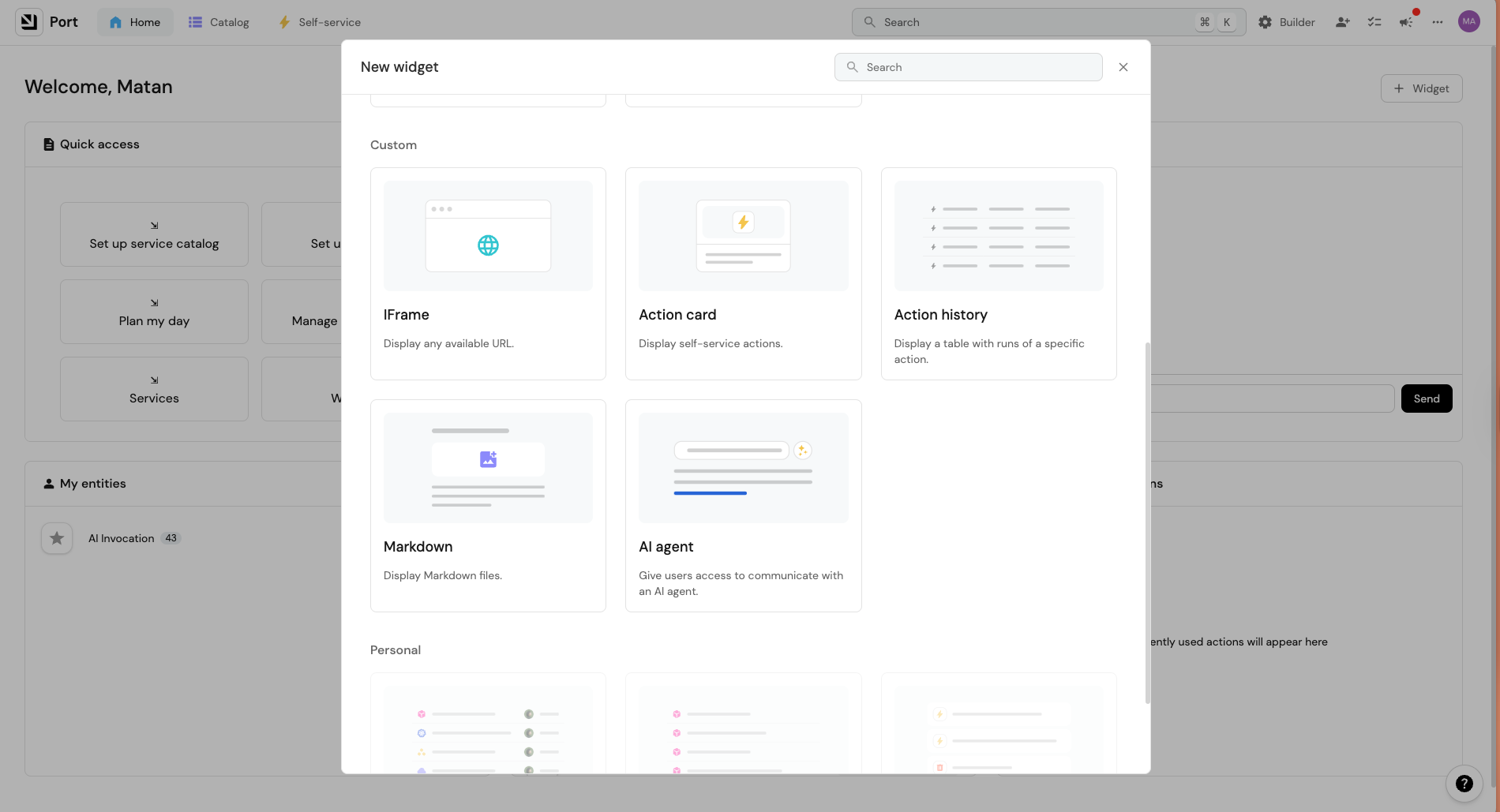 You can select which Port AI tools the widget can use during configuration. Available tools include data query tools for retrieving information from your catalog and action execution tools for running your self-service actions. This allows you to: