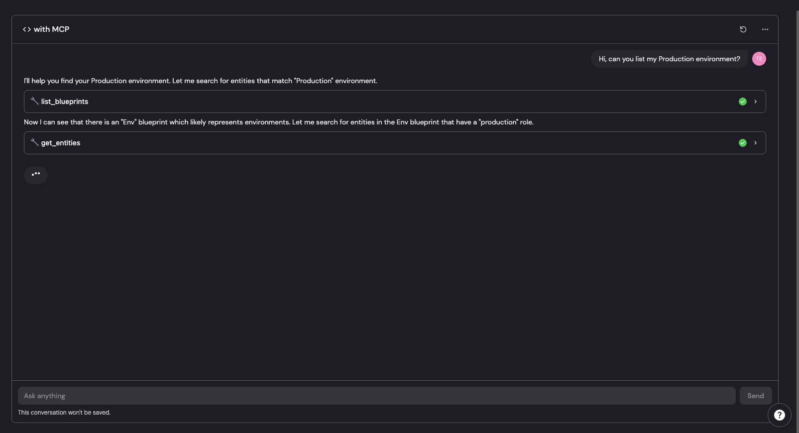 - On a service entity page: "What's the deployment status?" or "Show me recent incidents"