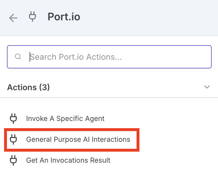 Select a Port node — Click the "Port.io" search result and select "General Purpose AI Interaction" (this is the easiest one to test with).