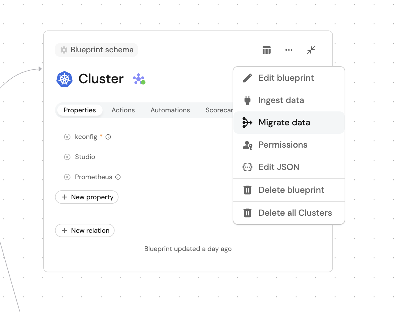 Click on the ... button of the blueprint you want to migrate, and select Migrate data from the dropdown menu.