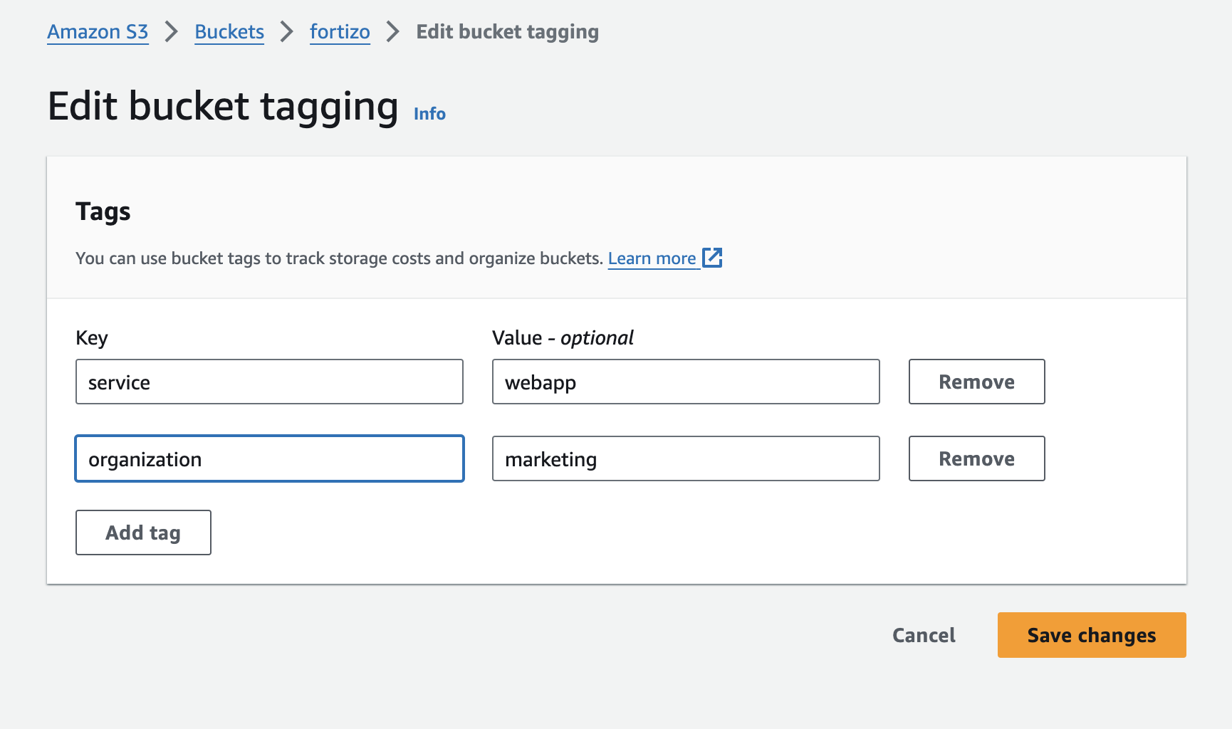 1. Add a tag to the bucket with the key service and a value representing the identifier of the service. For instance, if your service has an identifier of webapp, create a tag on the bucket with { "service": "webapp" }.