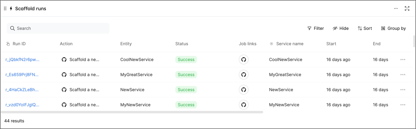 This widget allows you to create a table displaying all past runs of a self-service action in your portal.
