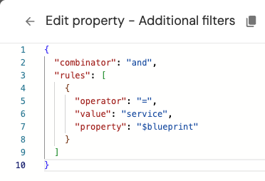 To achieve this desired state, we can go into one of the Service's profile pages and create a new visualization. After selecting the Deployment blueprint in the dropdown, we can add the following filter to the Filters array:
