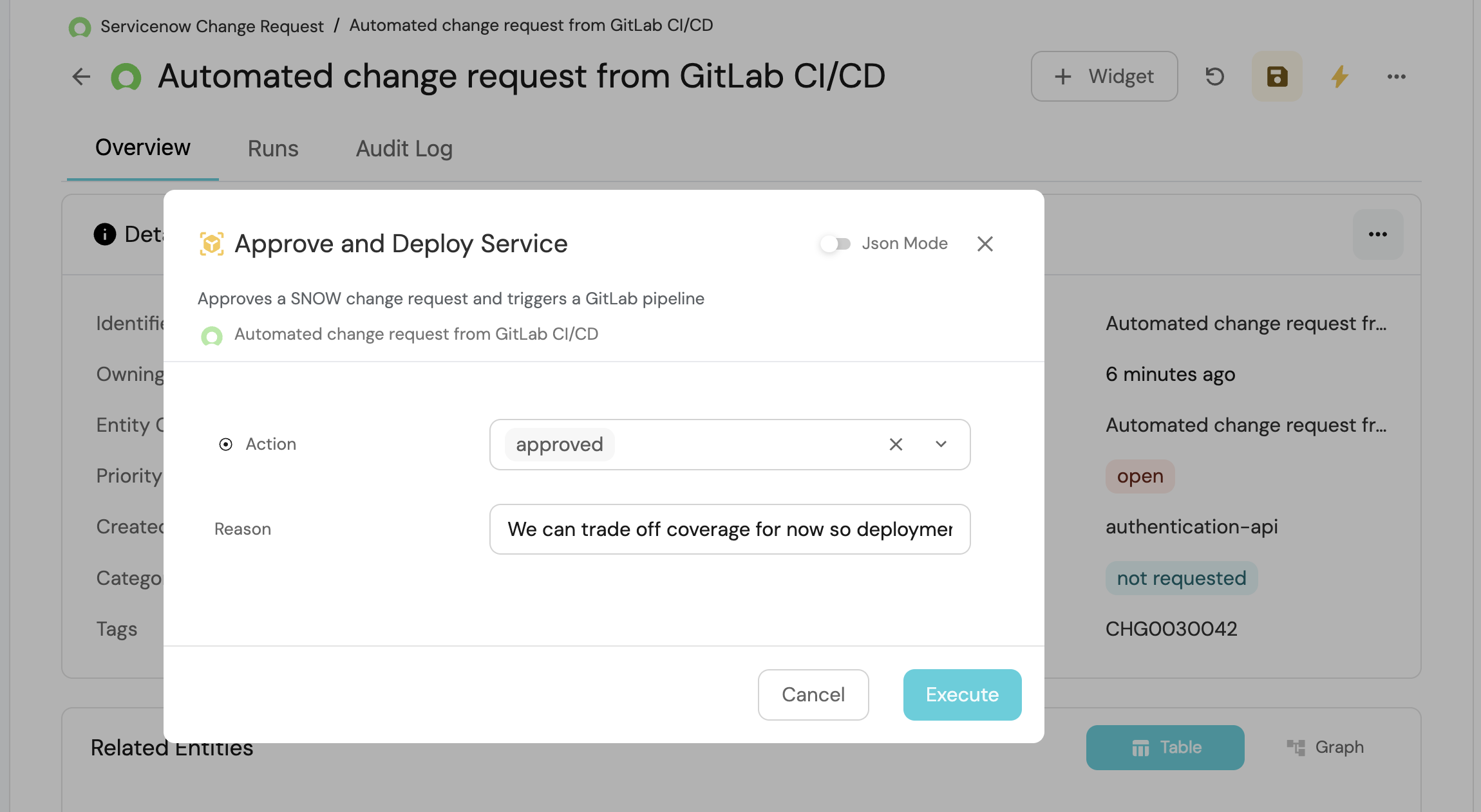 • CR decisions in ServiceNow UI trigger Port automation to update the pipeline.