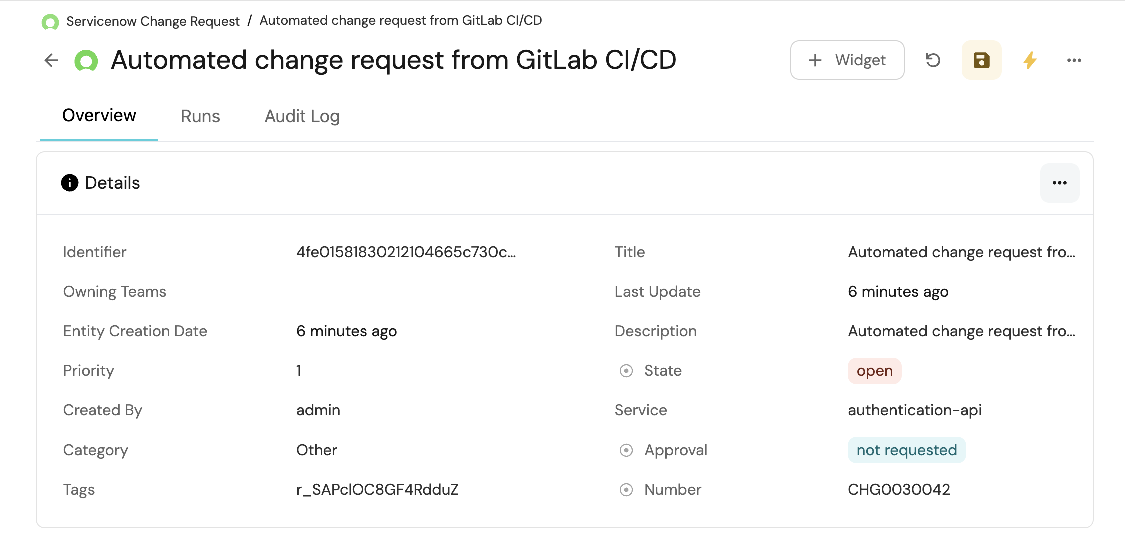 6. The platform engineer can see the servicenowChangeRequest entity displayed in Port