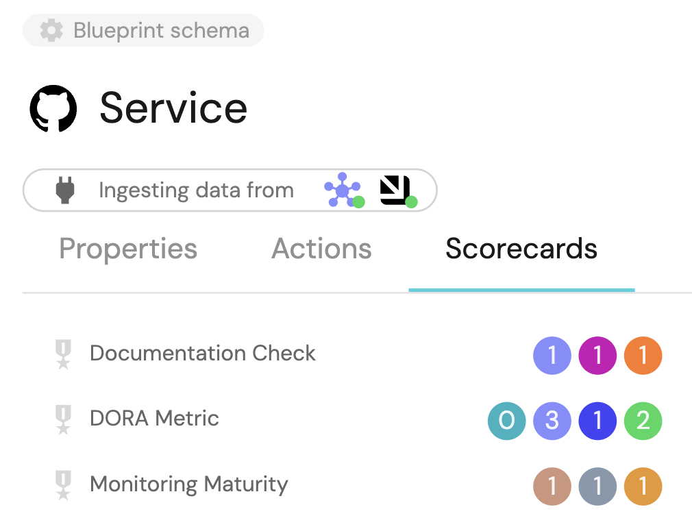 After configuring scorecards for the blueprint, each entity created from it will have a Scorecards tab in its entity page, detailing the different checks and their results:
